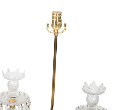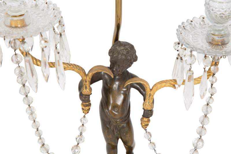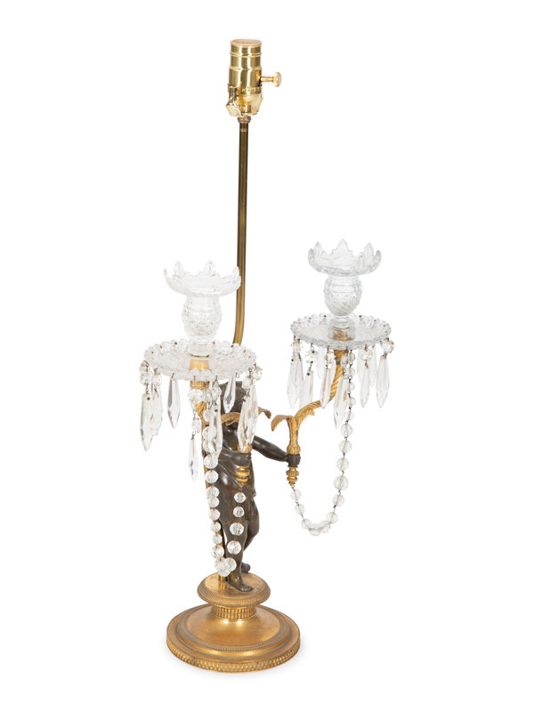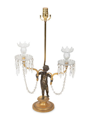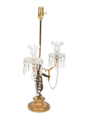 A Continental Bronze and Cut Glass Figural Candelabrum Mounted as a Lamp