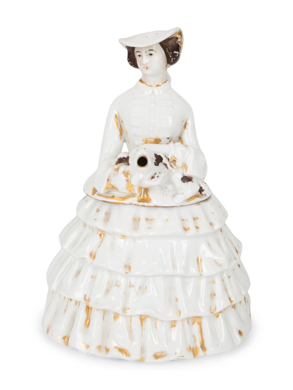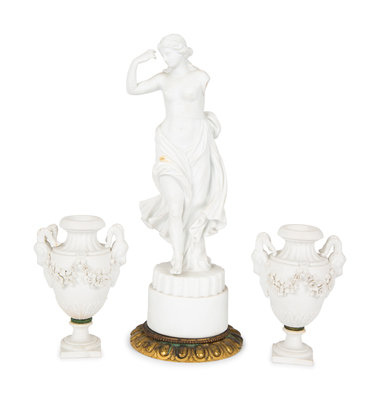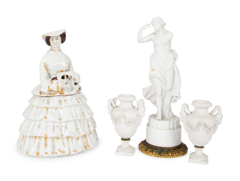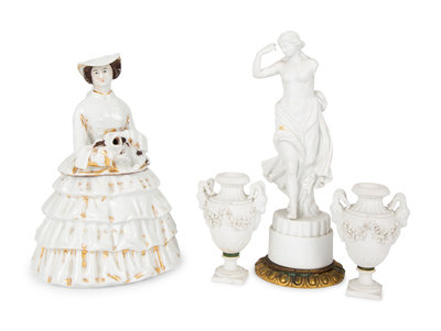 comprising a figural porcelain pot pourri, a bisque porcelain figure and a pair of bisque urns.