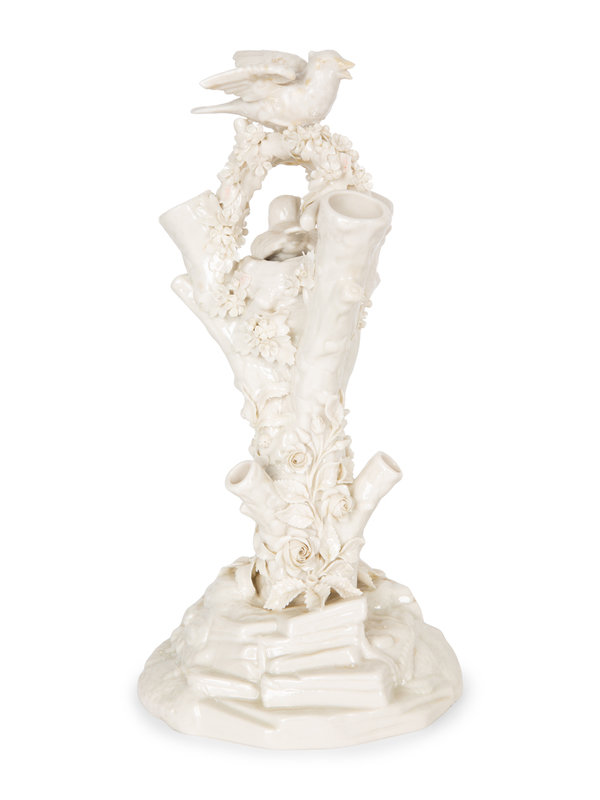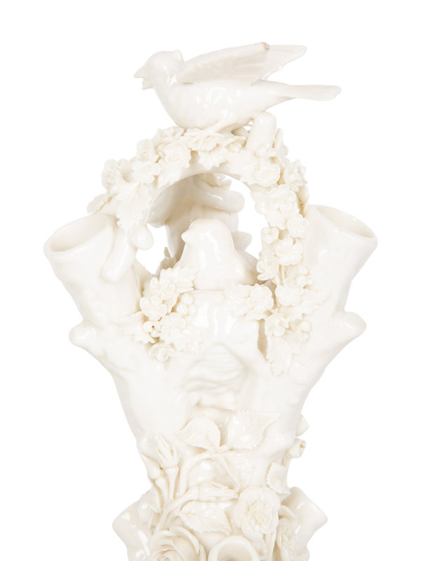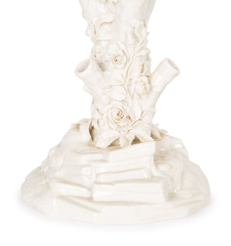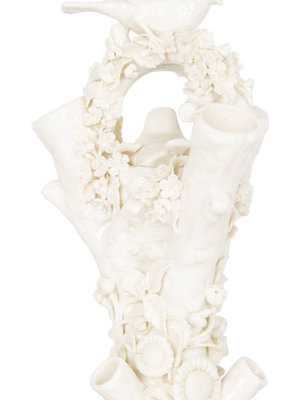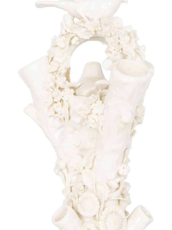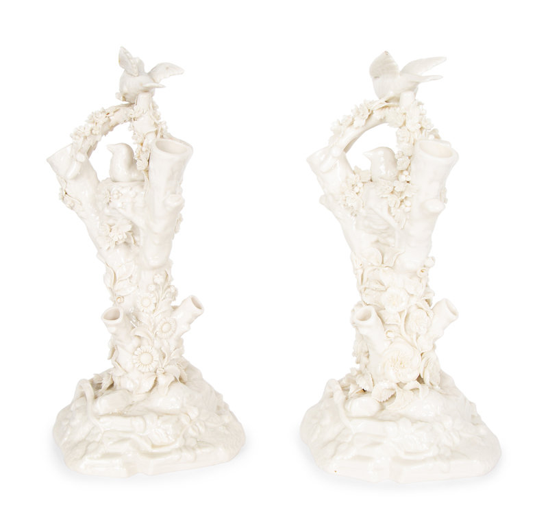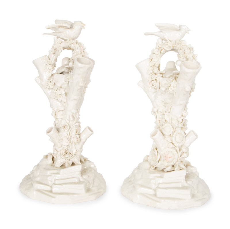 A Pair of Irish Belleek White Porcelain Bird's Nest Tree Stump Vases