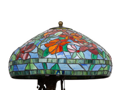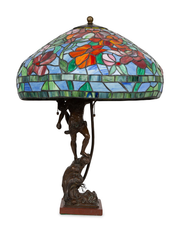 A Bronze Figural Table Lamp with Leaded Glass Shade