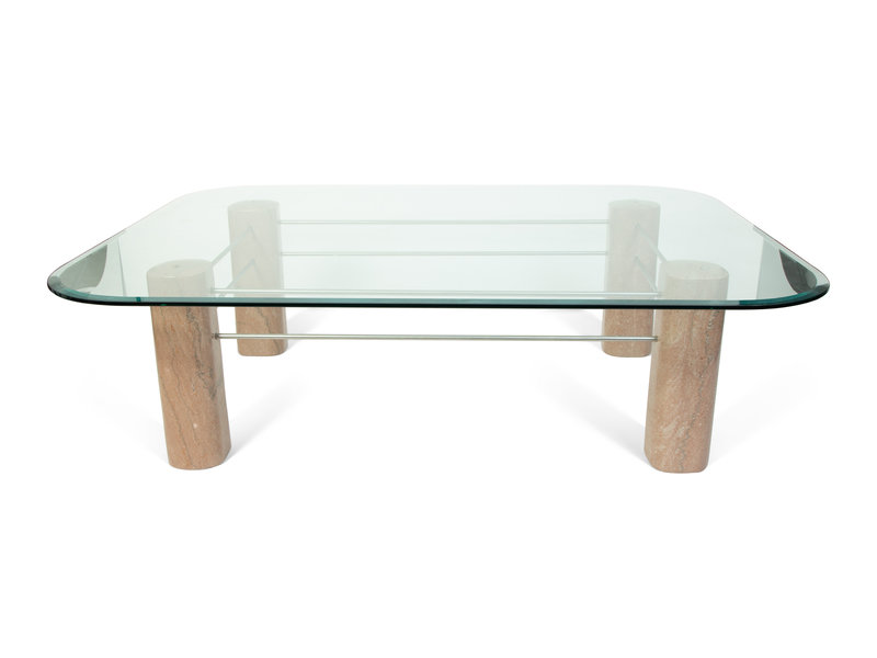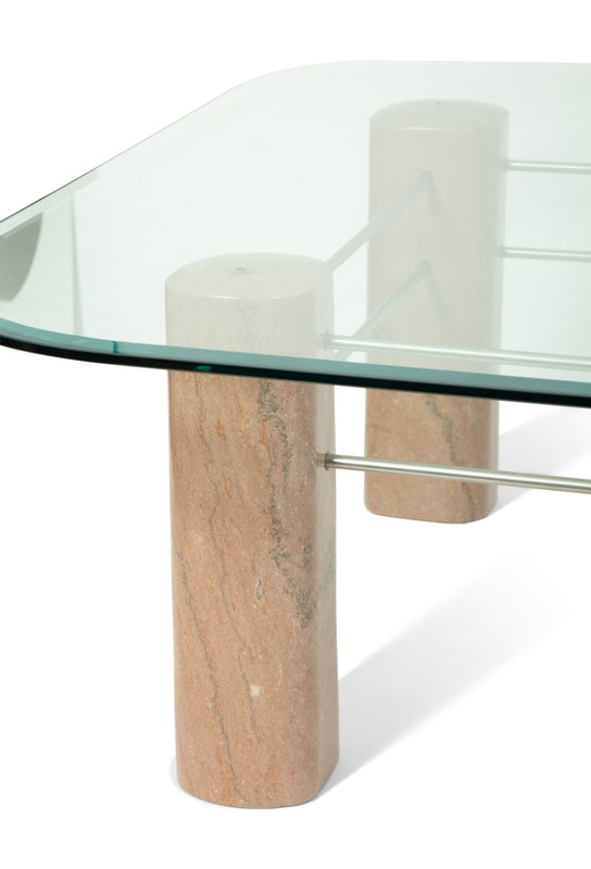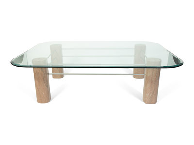 glass top table on sculpted marble and steel base