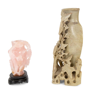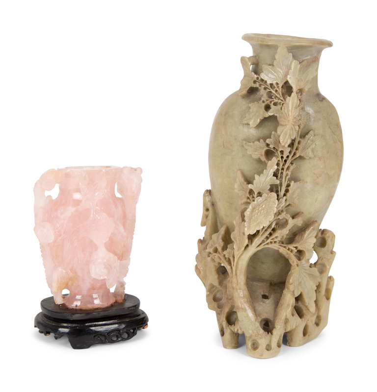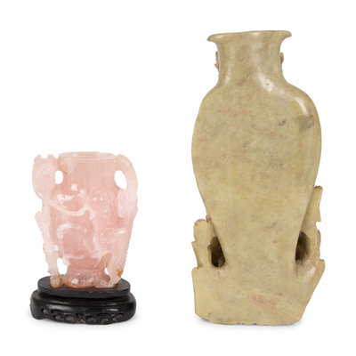 comprising a soapstone urn and a rose quartz urn.