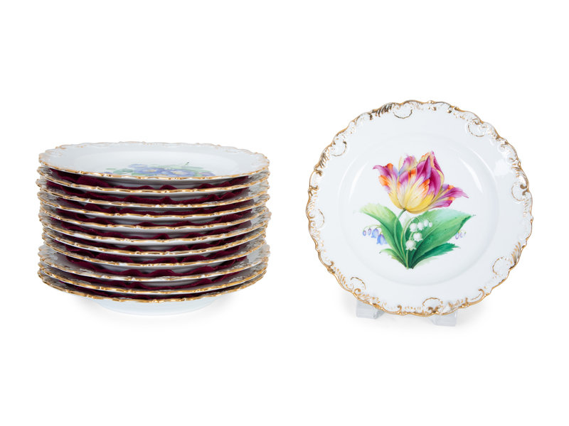 Twelve Meissen Porcelain Plates with Hand Painted Floral Decoration