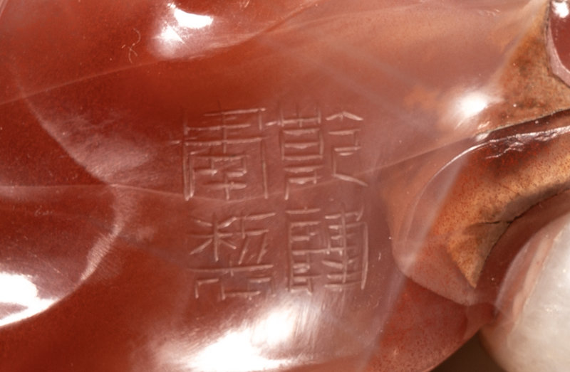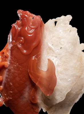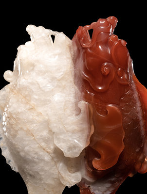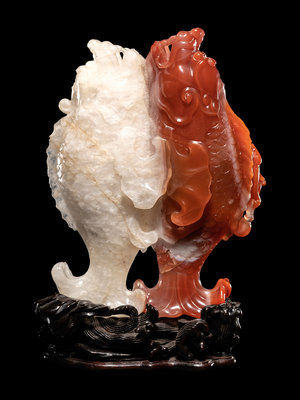 the double fish carved of bicolor agate to show one red and one white, supported on a hardwood stand.