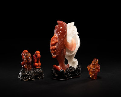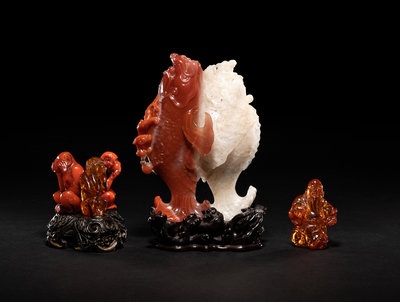 Two Chinese Amber Carvings and An Agate Carving of Double Fish