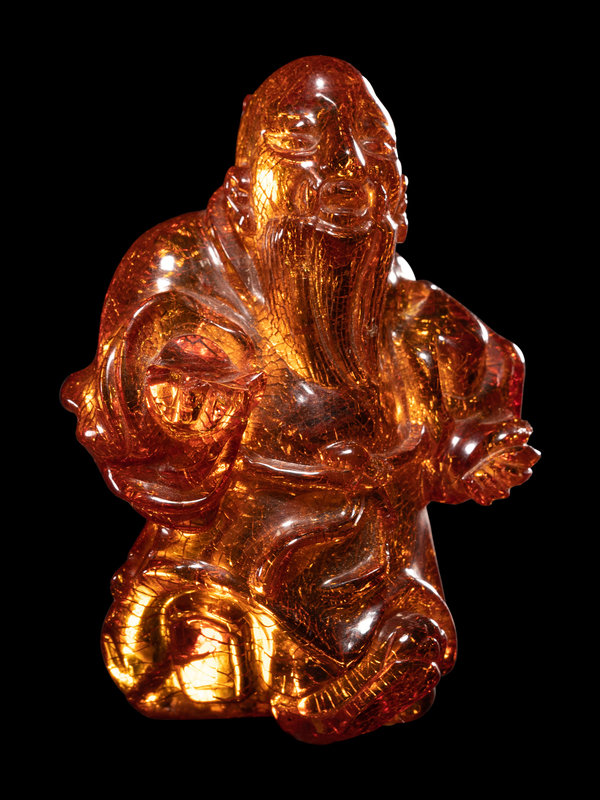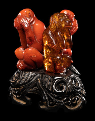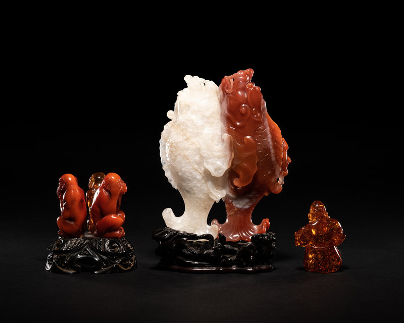 乾隆年製款瑪瑙巧雕雙魚擺件 連木座、琥珀三不猴擺件及壽星把件各一