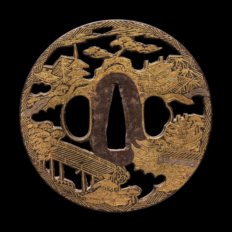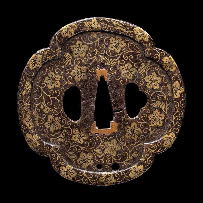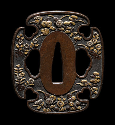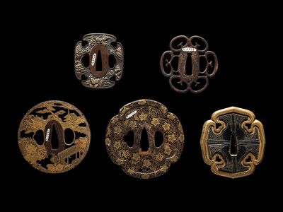 comprising three iron examples, one of floriform, the other two with brass inlays, the first showing a landscape, the second decorated with floral scrolls, signed; one mixed-metal example of mokko shape, shakudo nanako, decorated in gold and silver with chrysanthemums; one shakudo example with a brass mounted rim.