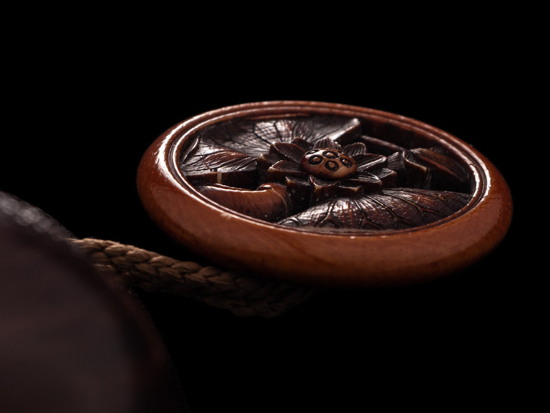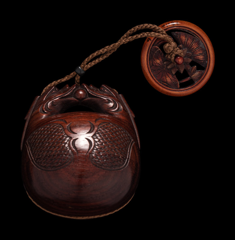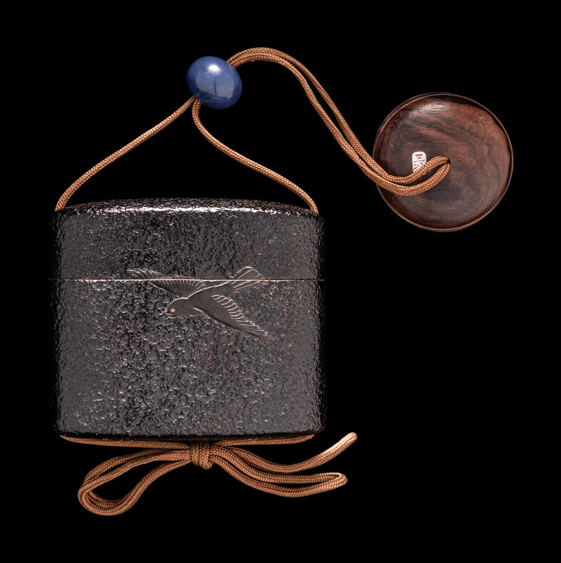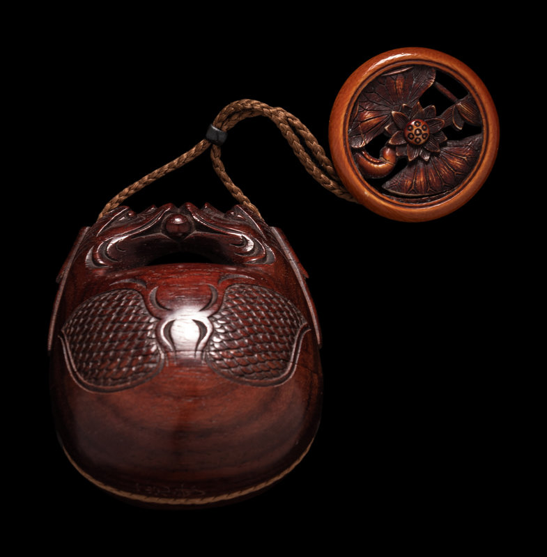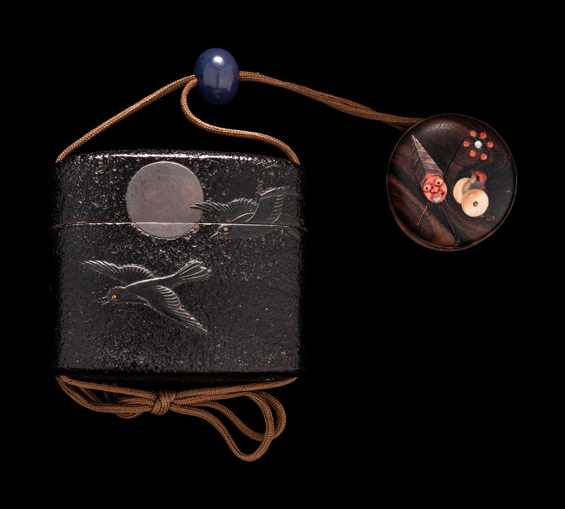 comprising a black lacquer example, decorated with three birds in flight underneath the moon, together with a blue glass ojime and an embellished wood netsuke in the shape of a covered box, signed Mitani, 三谷, on a mother-of-pearl inlaid panel; a hardwood example in the shape of two confronting dragons bearing a pearl of wisdom, signed, together with a reticulated wood lotus netsuke.