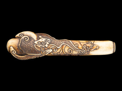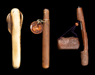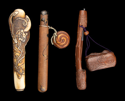 comprising a stag horn pipe case carved with mythical beasts; a brown, black and gold lacquer pipe case together with a circular netsuke in the form of a frog on top of a coiled snake; and a carved wood smoking set with a pipe, decorated with a tiger besides bamboo, together with a