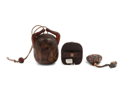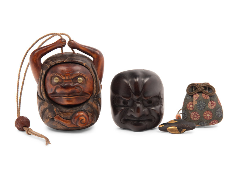 the first a carved tonkotsu in the form of an oni, together with a wood ojime; the second a large wood mask-form netsuke, signed 右澫; a cloth tobacco purse, together with a gold and grey lacquer bird-form netsuke, signed 其光.