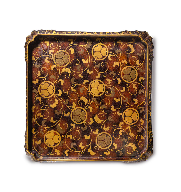 each with a square top panel above curved legs joined by a stretcher, decorated overall in gold hiramaki-e blossoming flowers borne on leafy vines.
