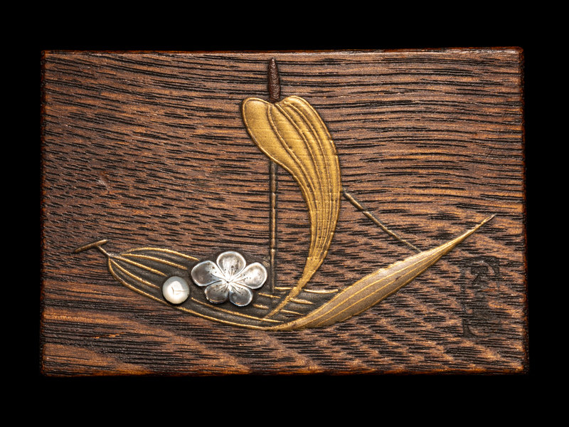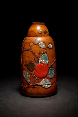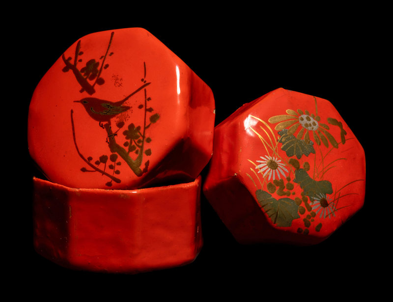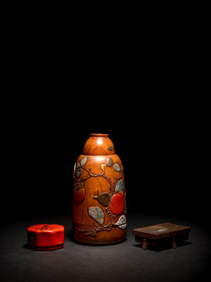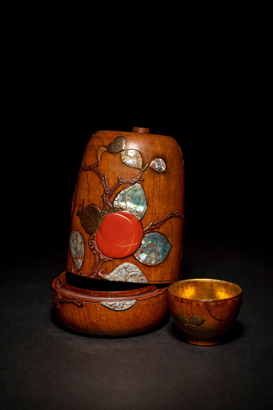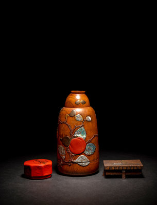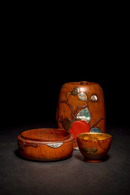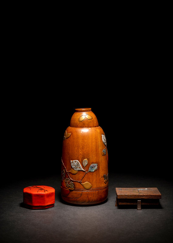 the first a set of two gold and red lacquered octagonal covered boxes, decorated in gold lacquer with bird and flowers; the second an embellished wood water vessel with a small bowl and a small cup, depicting persimmons on leafy vines; the third a small chest-form wood box, the cover decorated in gold and with mother-of-pearl inlays, showing two leaves forming a boat with a prunus flower atop.
