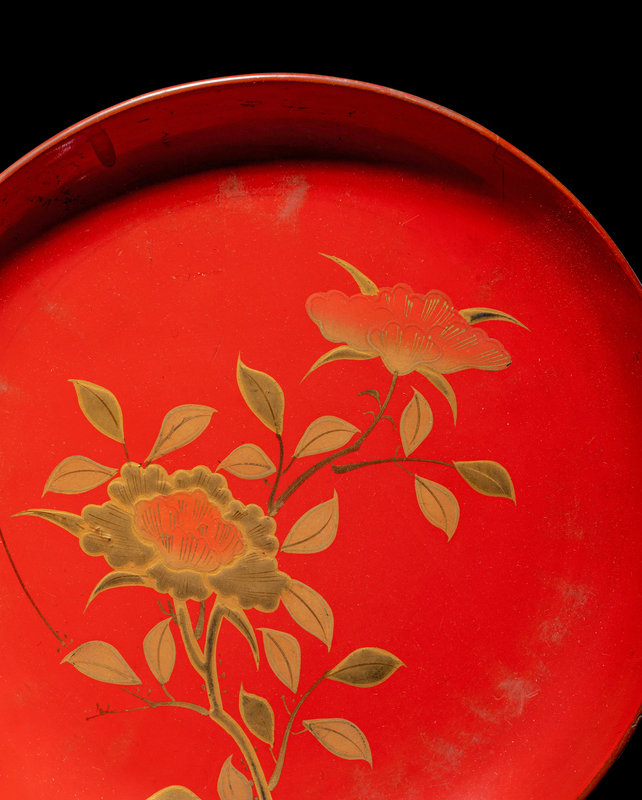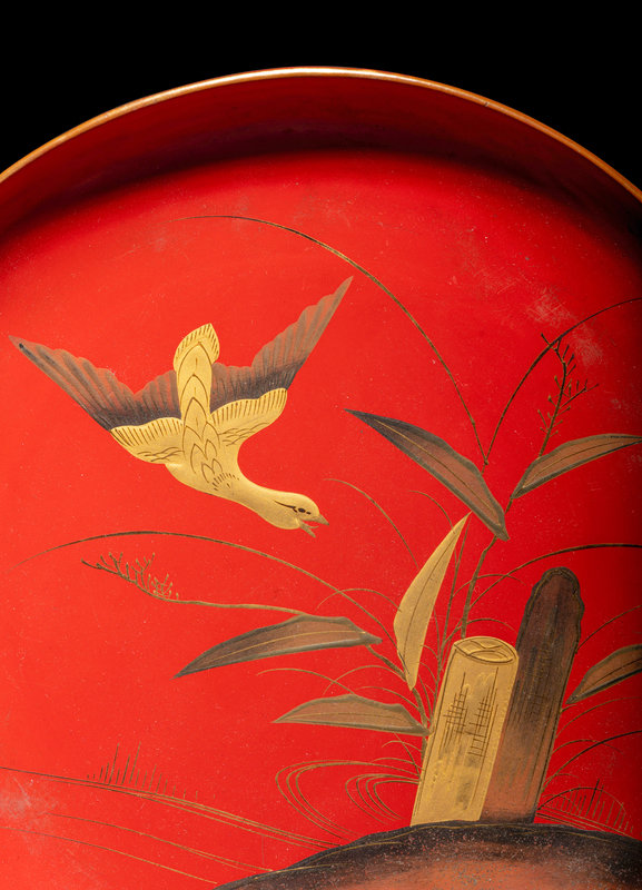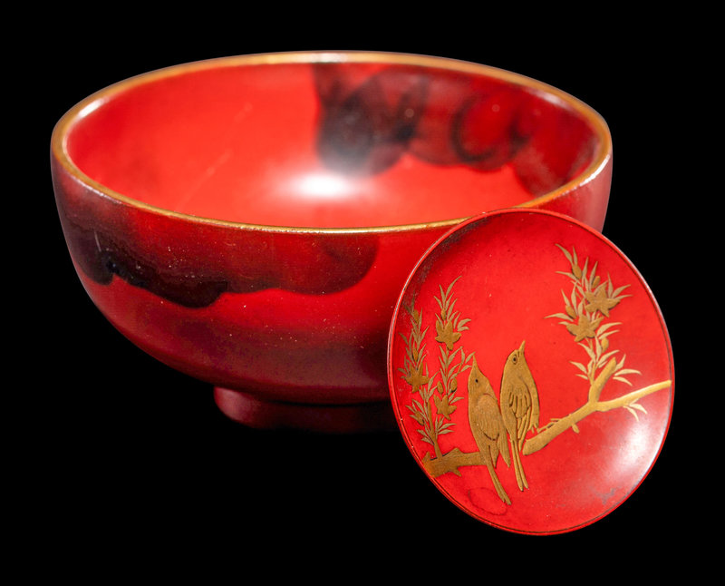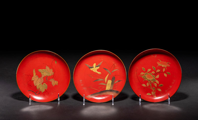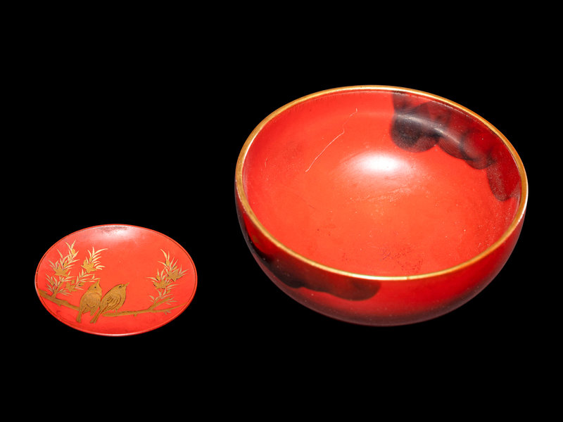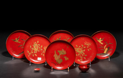 comprising a set of six dishes, a miniature bowl and a cup, decorated in gold lacquer with birds and flowering plants against a red ground.