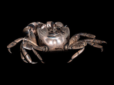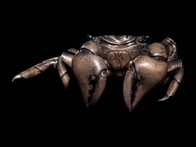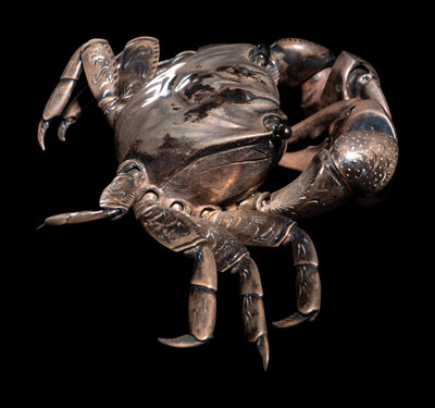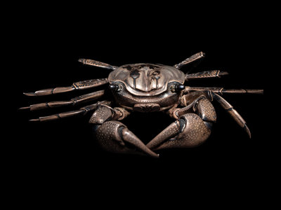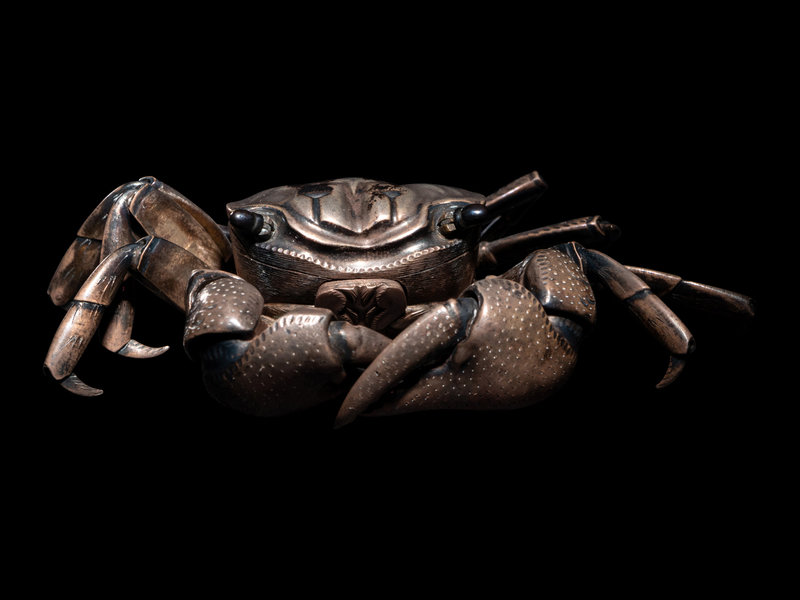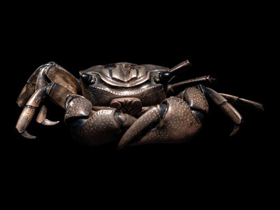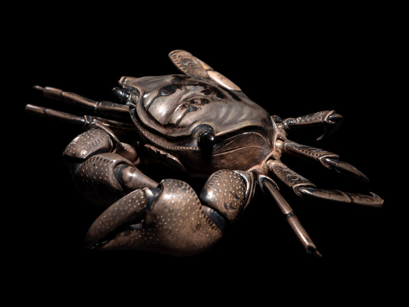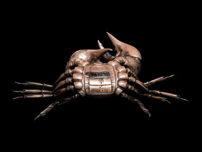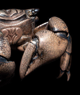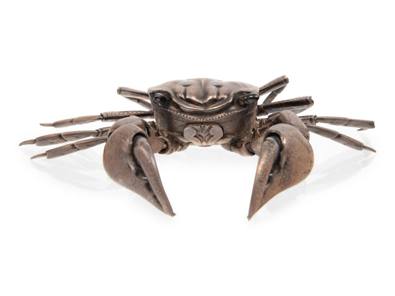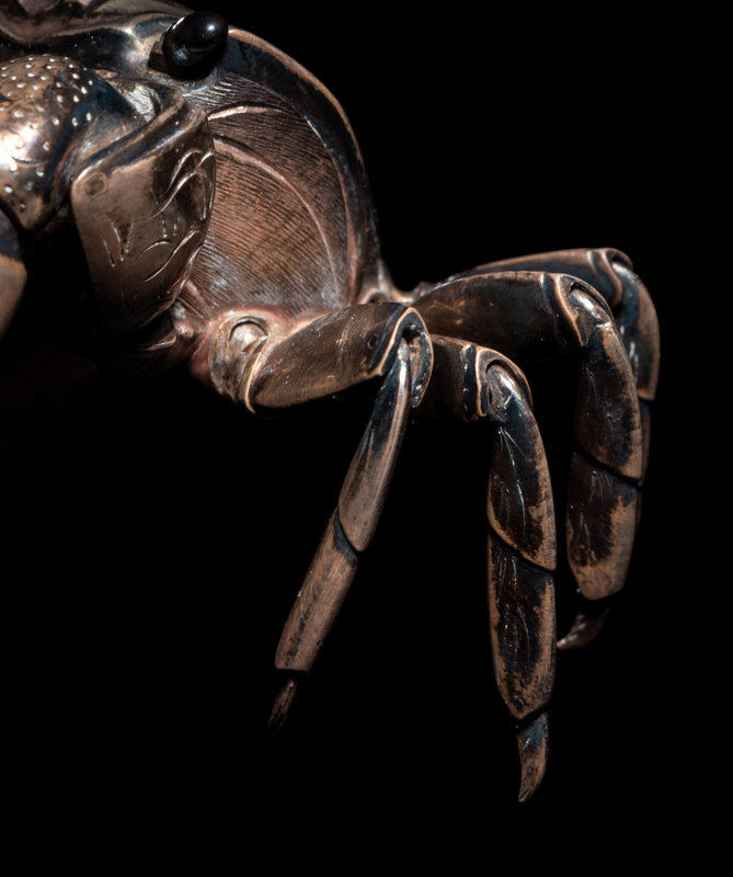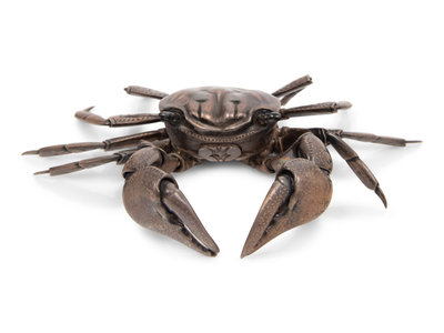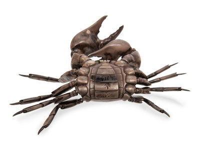 naturalistically cast, the legs and claws fully articulated, the surface worked to resemble the crab's natural shell, signed on the belly with a two-character maker's mark.