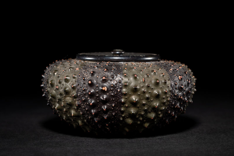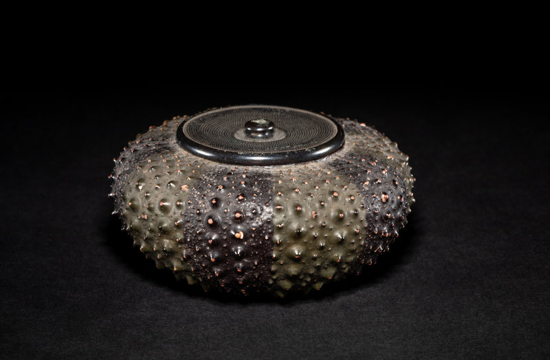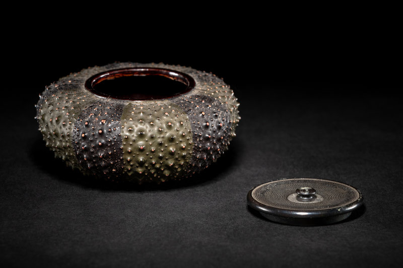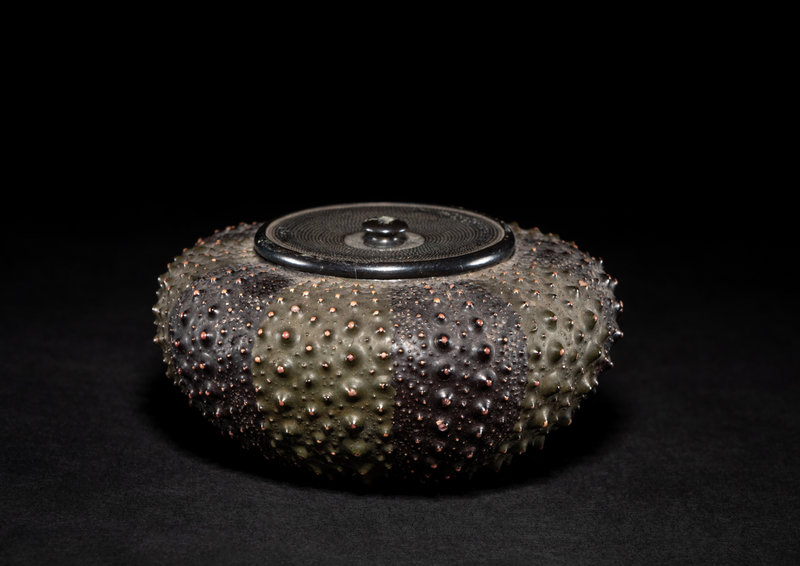 naturalistically formed, the compressed globular body with short spikes, together with a bronze cover.
