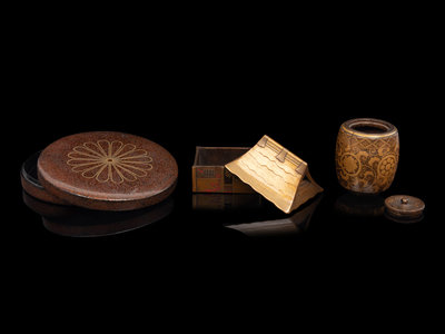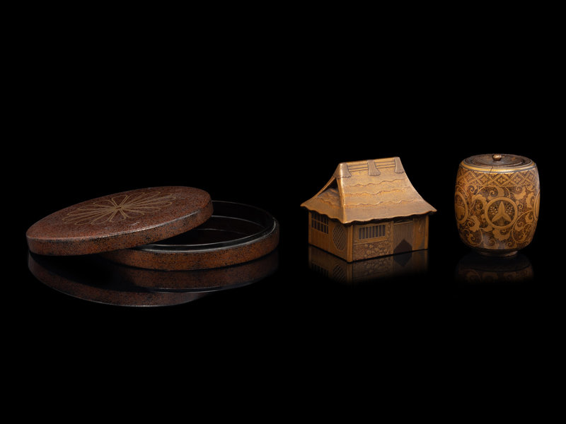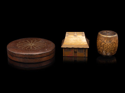 the first of circular form, the cover decorated in gold with a blossoming chrysanthemum on a nashiji ground, the second in the shape of a house with the roof forming the cover, the third a miniature barrel-form covered box, decorated in gold showing flower-heads and entwined vines against a nashiji ground.