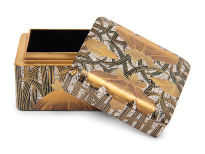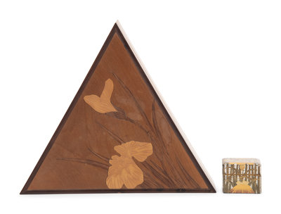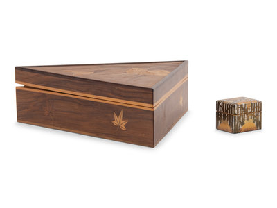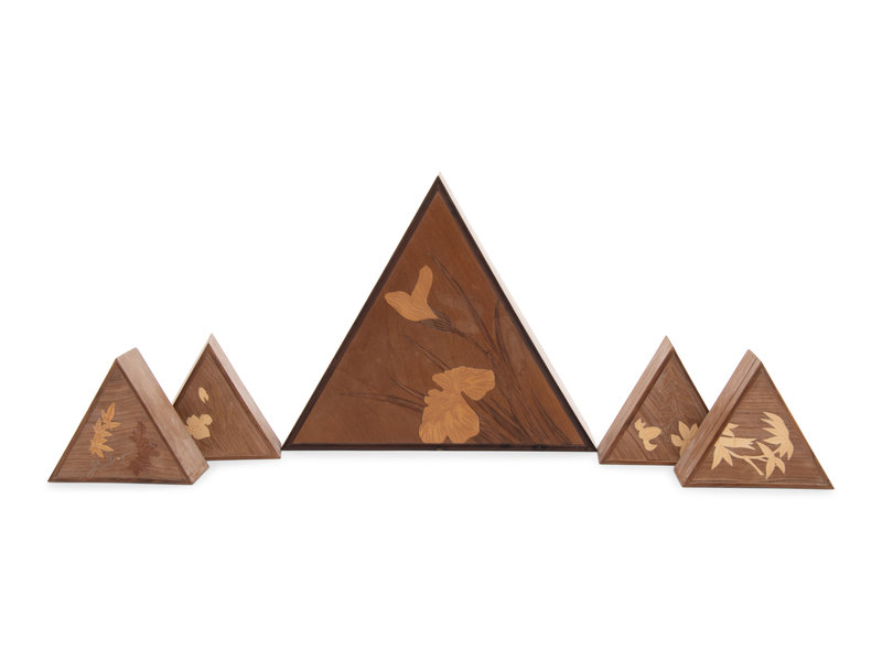 comprising a set of five painted and carved wood triangle boxes, and a gold and white lacquered square box and cover, all decorated with floral motifs.