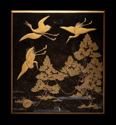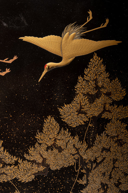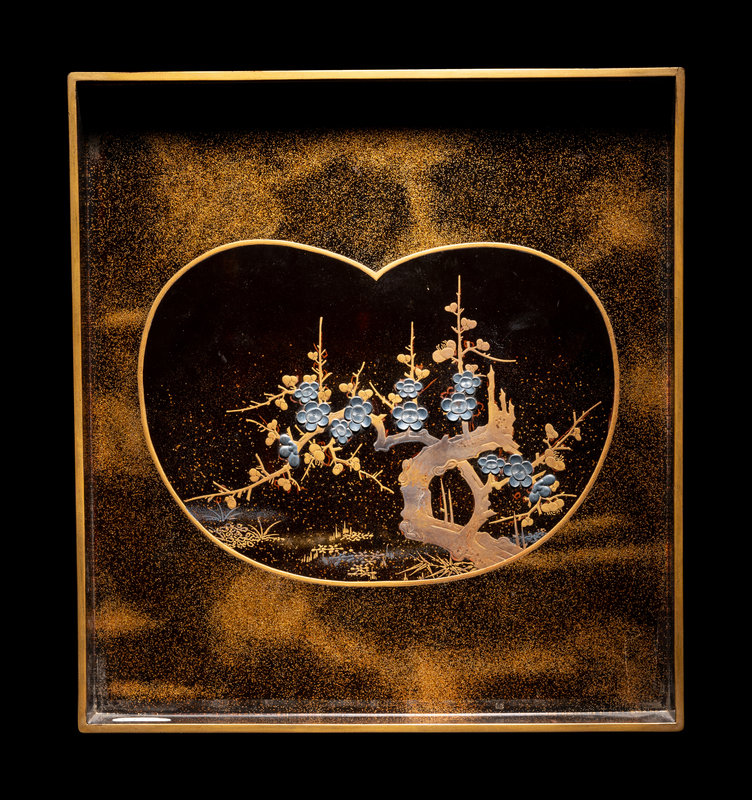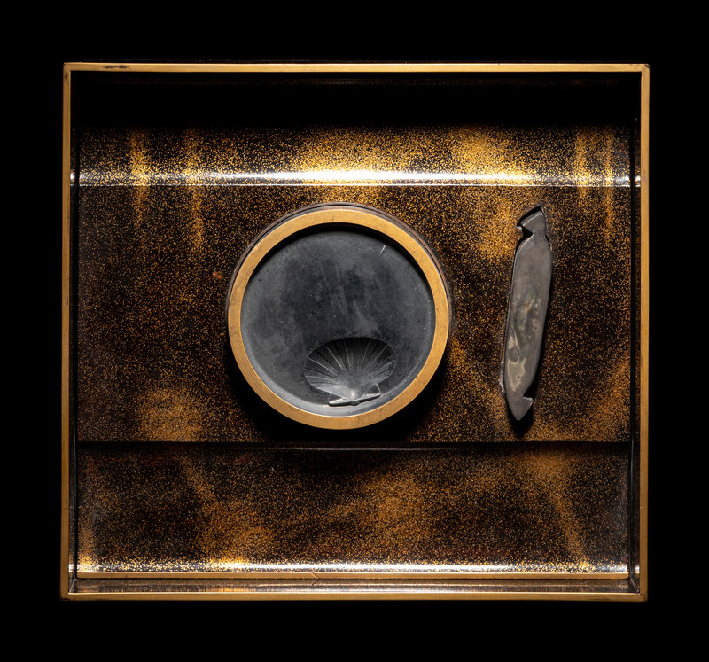 the cover decorated in gold with three cranes above pine trees, the inside of the cover decorated with a shaped panel enclosing high-relief prunus blossoms on gilt highlighted branches, together with a silver water dropper and a circular inkstone with shell motif, the interior of nashiji lacquer, unsigned.