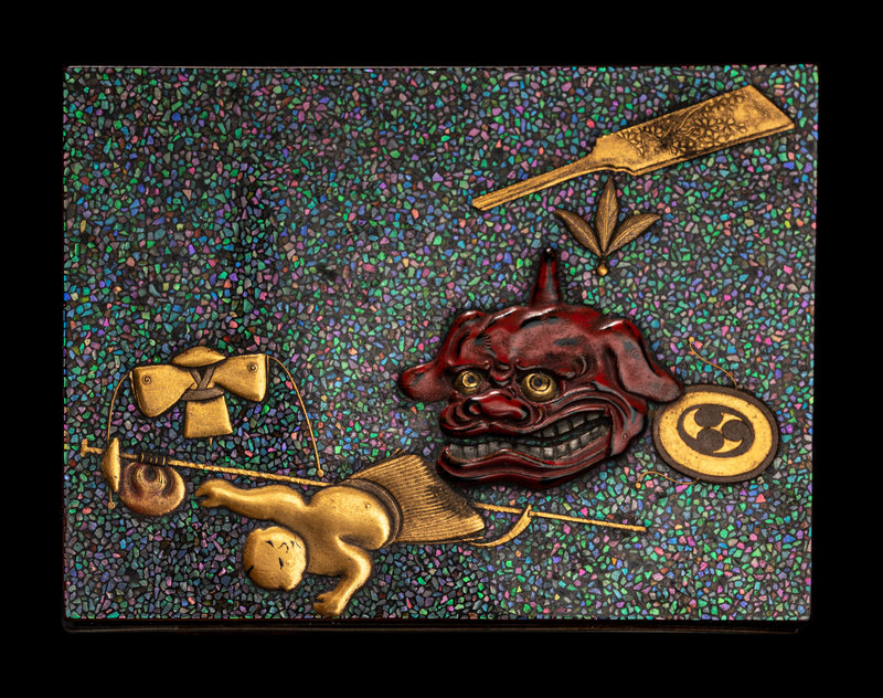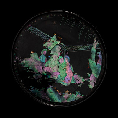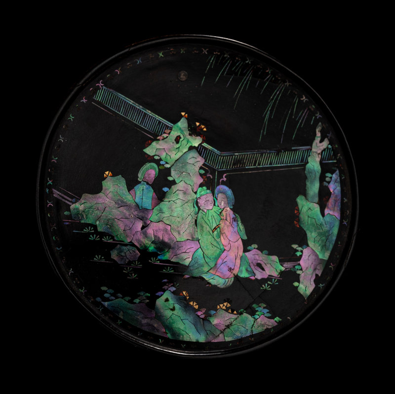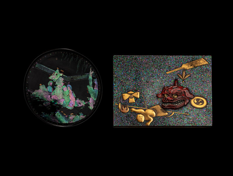the first a Chinese lac-burgate circular box, decorated with a loving couple in a garden; the second a Japanese black and gold lacquer mother-of-pearl inlaid rectangular box, with relief decoration showing a figure, a shishi lion, a set of cloth and a fan.