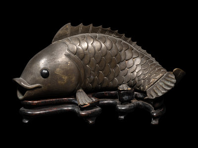 comprising a brass vase, two brass covered boxes, one bronze okimono, and an bronze incense burner cast in the form of a scholar sitting atop the carp.