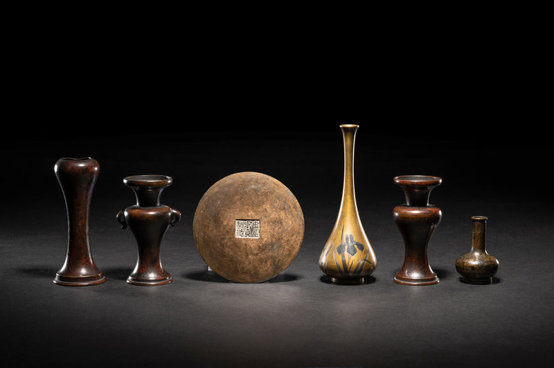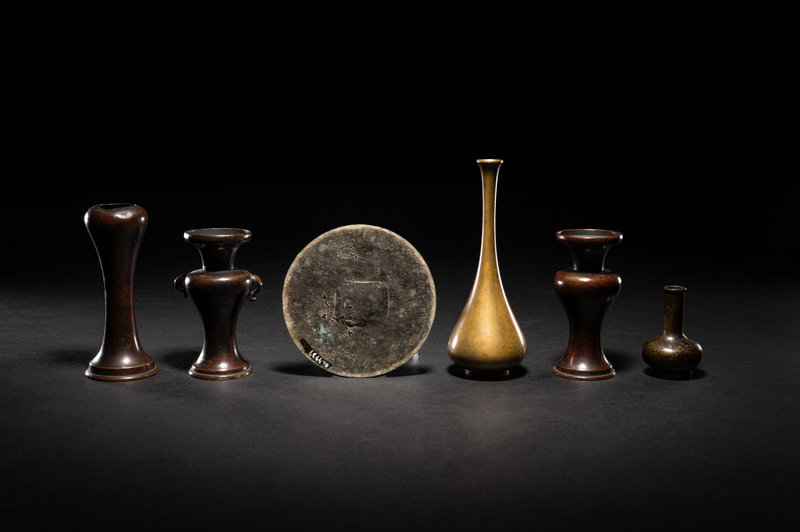 comprising a circular mirror, three vase with broad shoulders and two bottle vases.