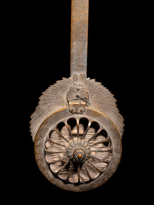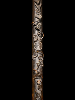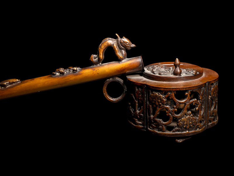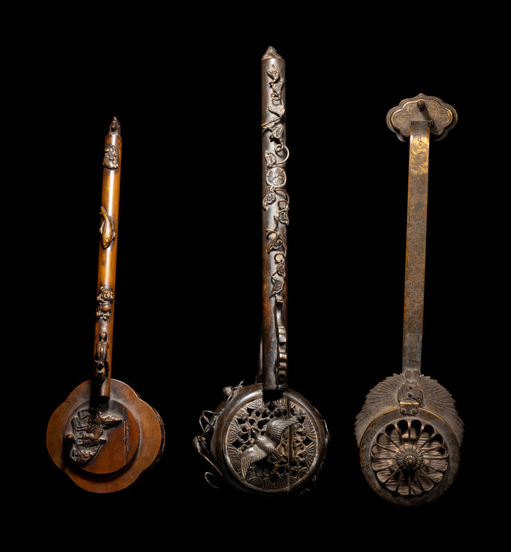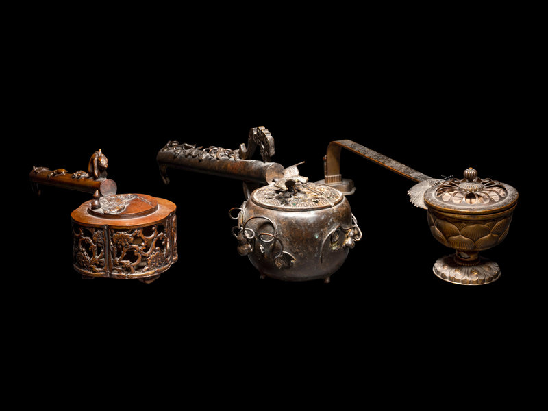 each having a long handle, the first of quatrefoil form with reticulated walls decorated with lotus scrolls; the second of globular form, the exterior applied with leafy vines; the third in the shape of a lotus blossom.