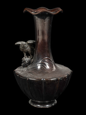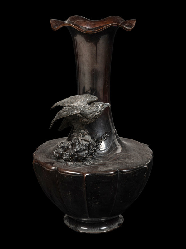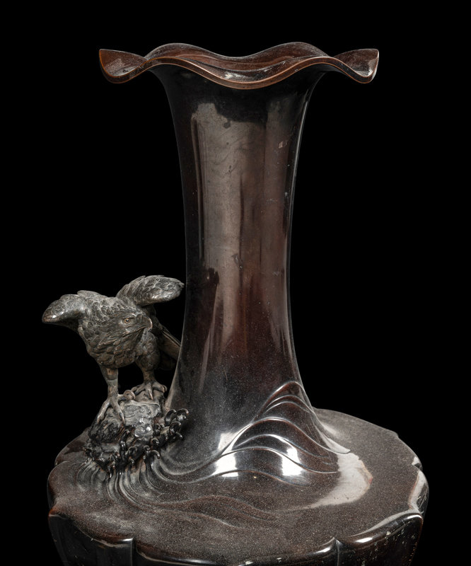 the lobed body with sloping walls tapering to a short foot, cast in relief depicting an eagle resting crashing waves on the shoulder, the tall neck risting to a lobed mouth rim.