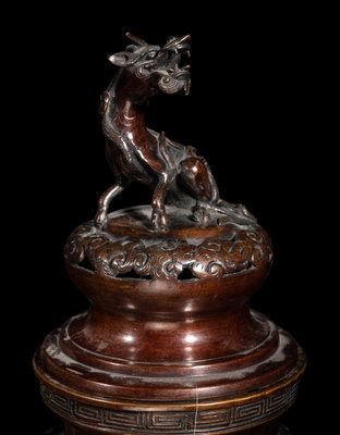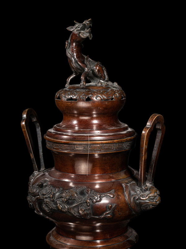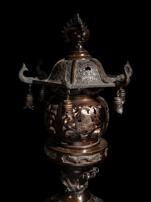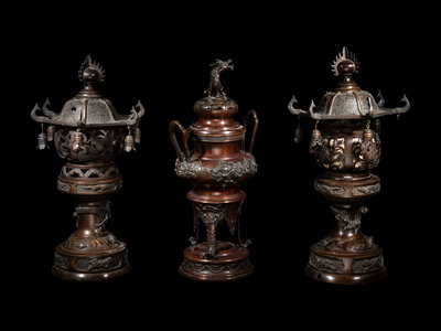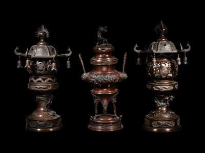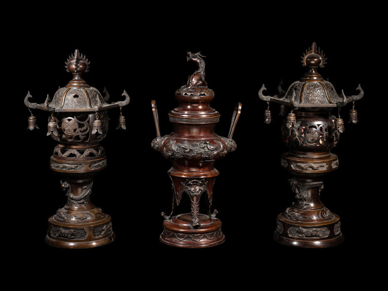 each lantern of globular form with reticulated walls, the cover in the form of the roof, suspending various bells, all raised on a tall, recessed stand, cast with multiple dragons; the incense burner with a compressed body, decorated with birds amongst floral blossoms, set with a pair of beast masks and upright handles, raised on three curved feet issuing from lion heads, the recticulated cover topped with a kirin-form finial.