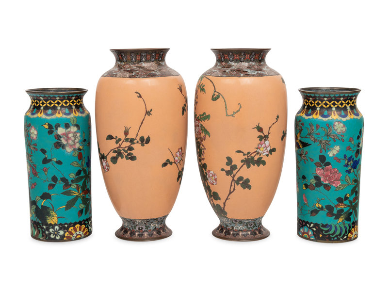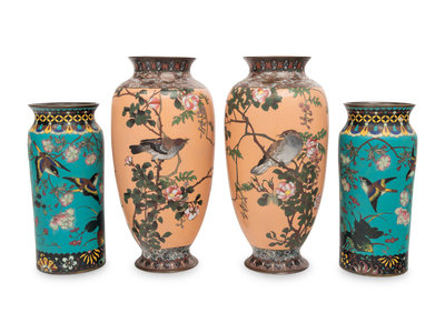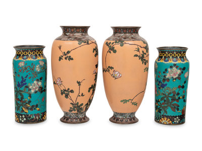the first pair of apricot-ground, painted with birds perched on flowering peonies, the second of blue-ground, decorated with magpies amongst prunus branches, all unsigned.