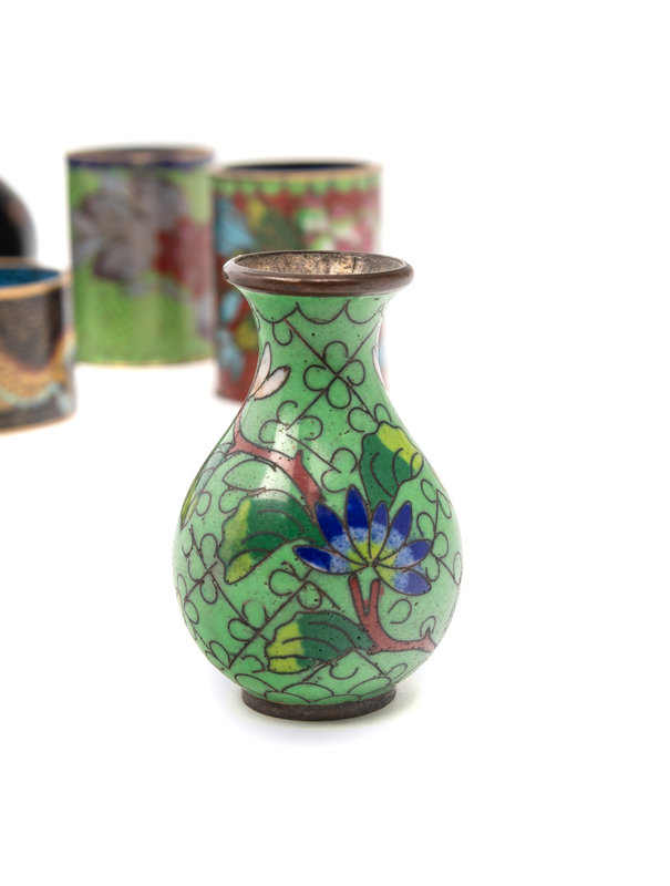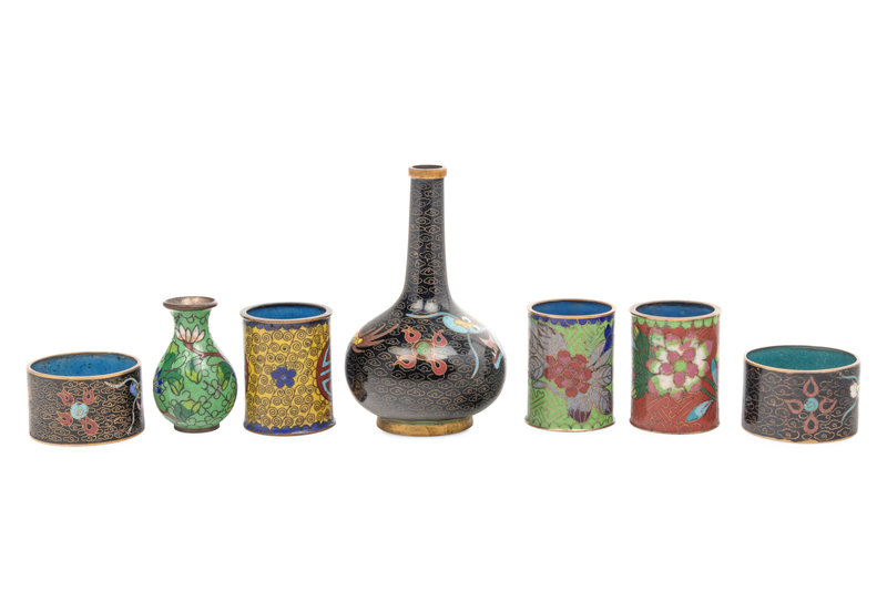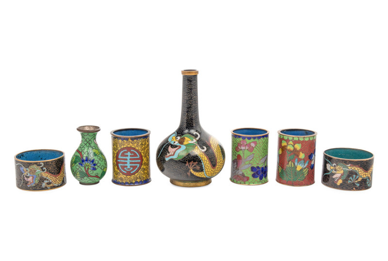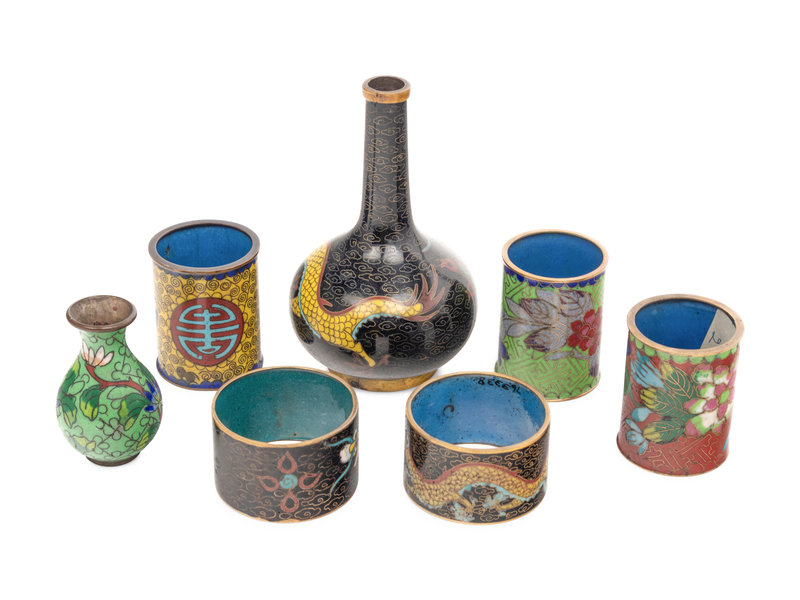 comprising a pair of napkin rings and a bottle vase, each decorated with a dragon on a black ground; a baluster jar painted with a lotus sprig against a green ground; three cylindrical brush pots with floral motif and longevity characters.