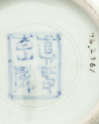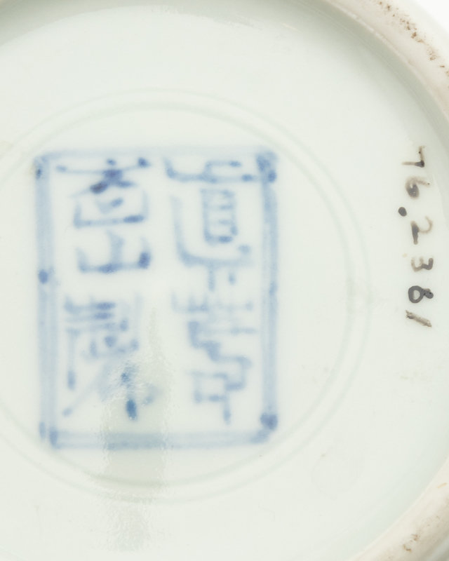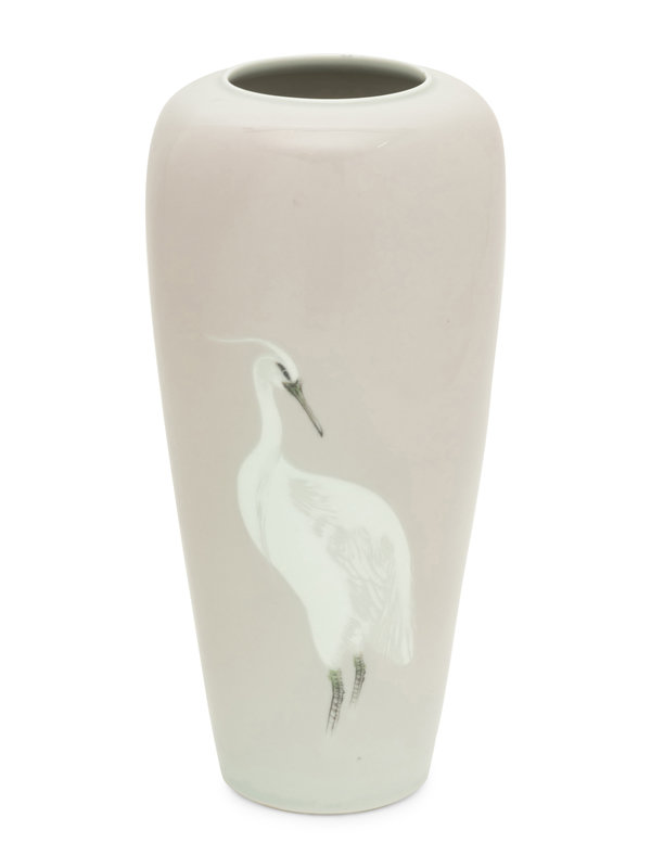 of slender form, painted with a standing egret against a light beige ground, the underside bearing a four-character underglazed blue mark within a square panel.