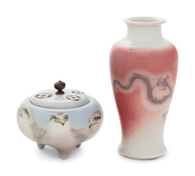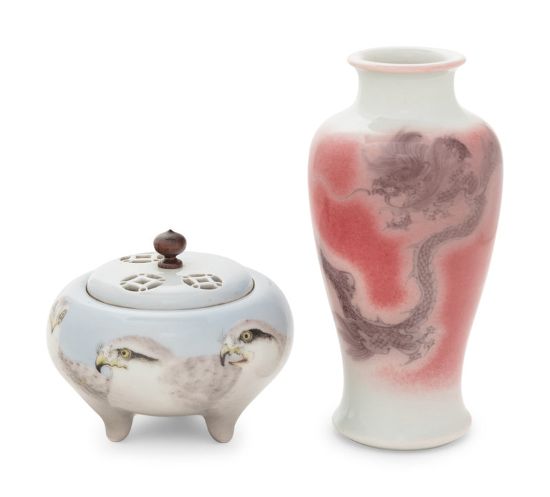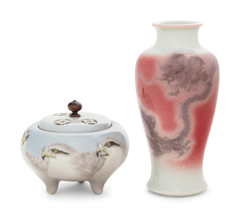 comprising a copper red glazed porcelain 'dragon' vase, and a tripod incense burner, koro, decorated with eagles on a light claire-de-lune ground, the cover decorated with reticulated coin motif, each bearing a four-character underglazed blue mark within a square panel.