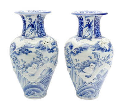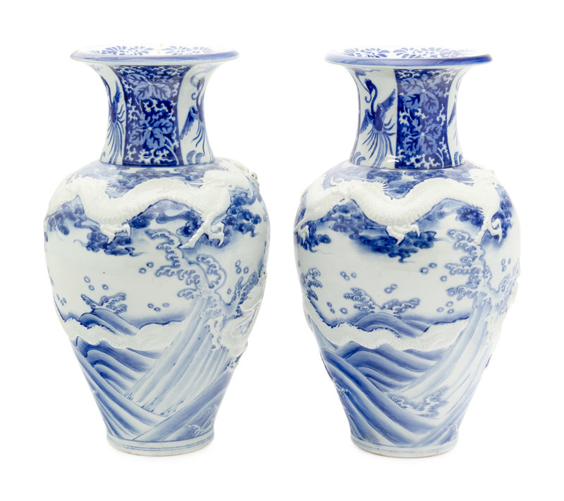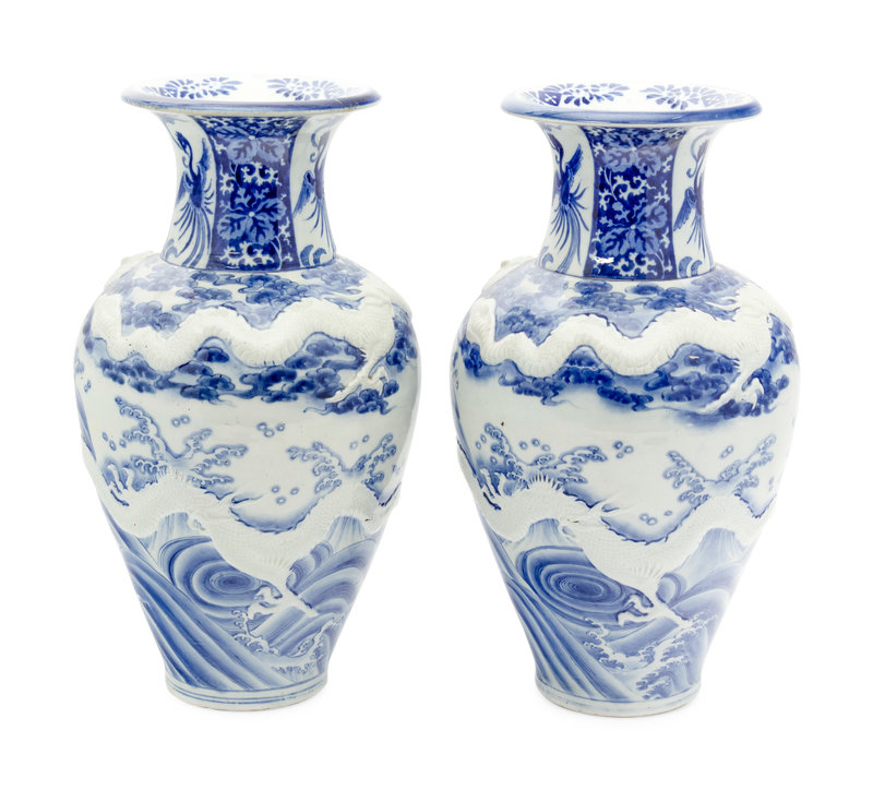A Pair of Large Japanese Blue and White Porcelain 'Dragon' Baluster Vases