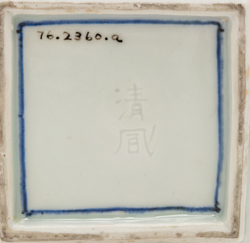 the square box decorated with roundels and shaped panels enclosing figures and floral motifs, the underside bearing a two-character mark.