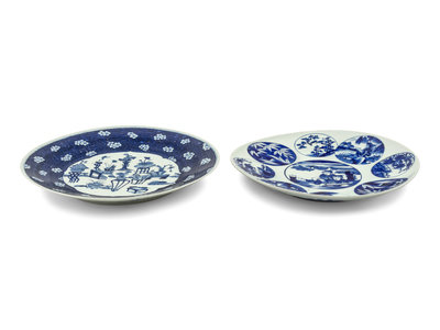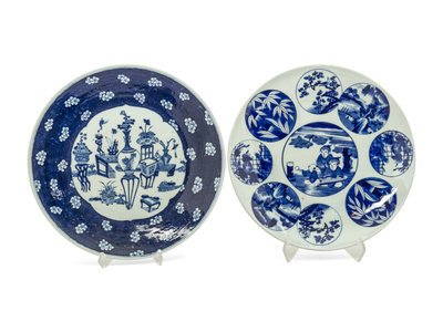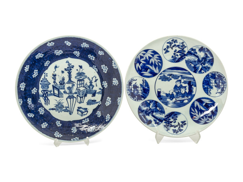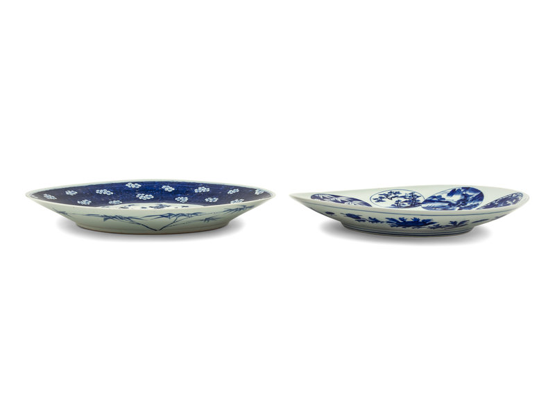 the first centered with a floriform panel enclosing auspicious objects, set above a dark blue ground with flower heads; the second decorated with various roundels filled with floral designs, landscape and figures.