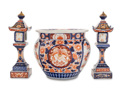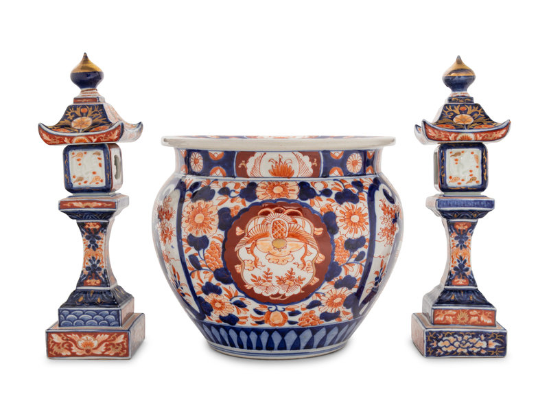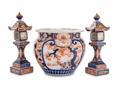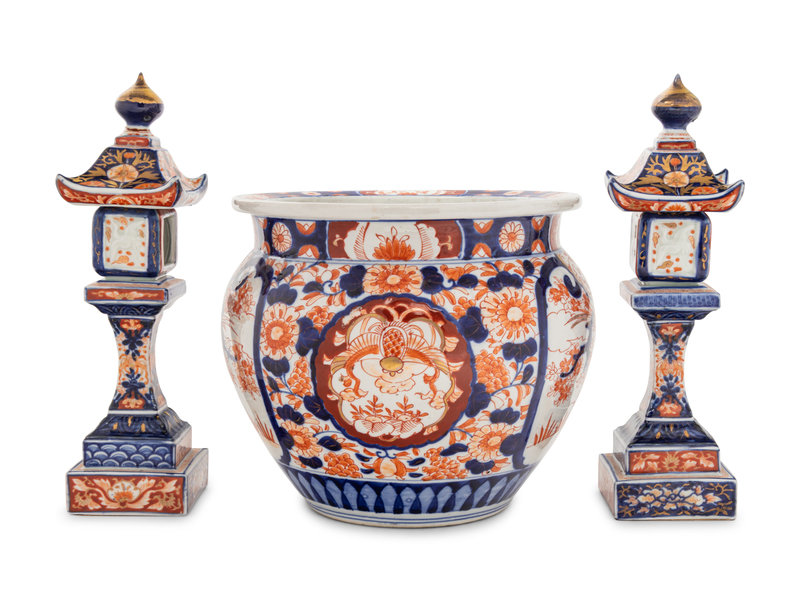 comprising a pair of gilt decorated pagoda-form incense burners, and a fish bowl, all decorated with floral scrolls.