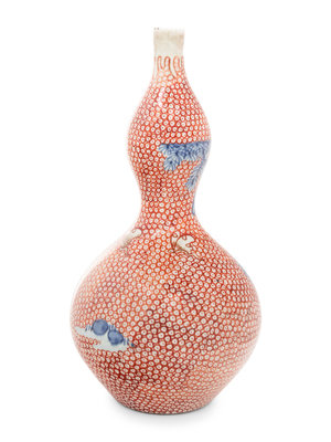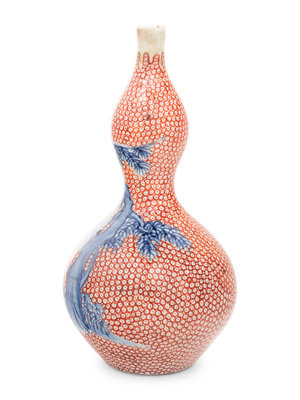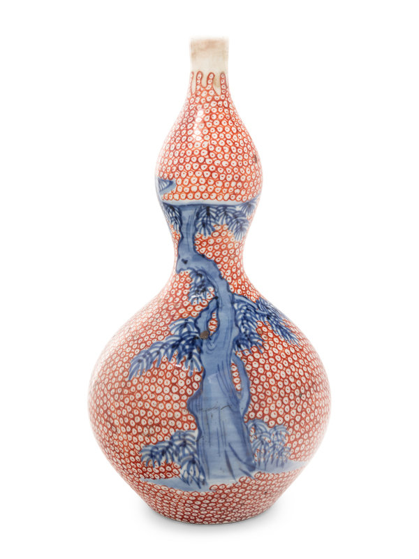 decorated with a tree in underglaze blue, all set on a red enameled ground.