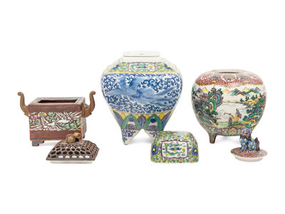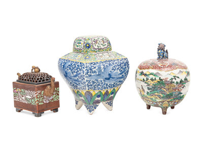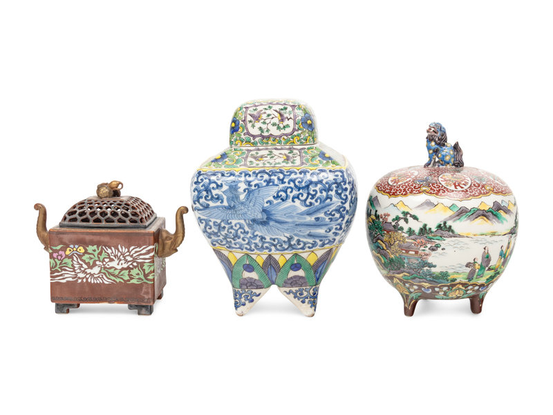 comprising an underglaze blue and polychrome enameled incense burner, a brown glazed and gilt decorated example, and a Kutani jar painted with landscapes.