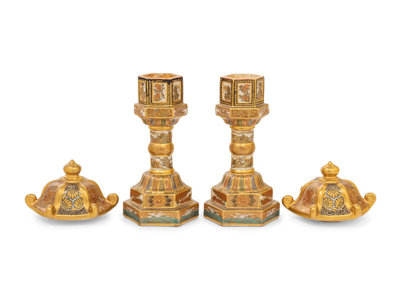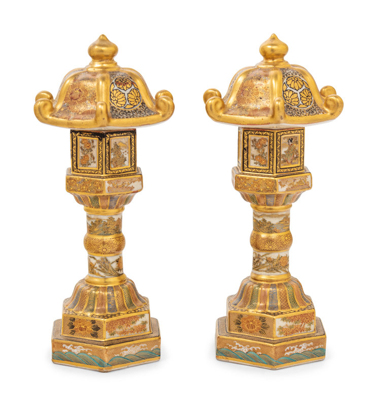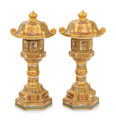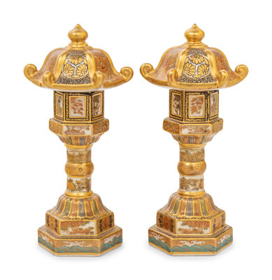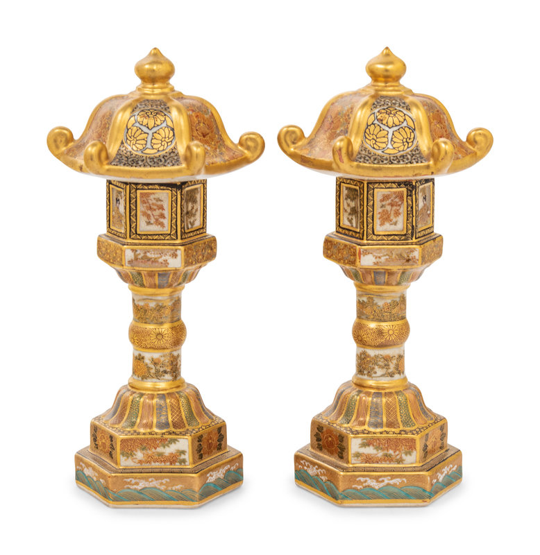 A Pair of Japanese Satsuma Porcelain Pagoda-Form Incense Burners