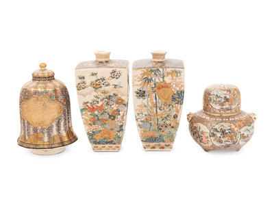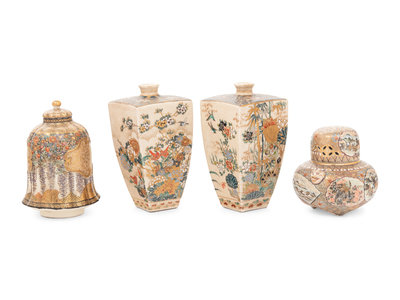 a bell-form vase and cover, painted with floral decoration; and a pair of rectangular vases decorated with floral blossoms and plants.