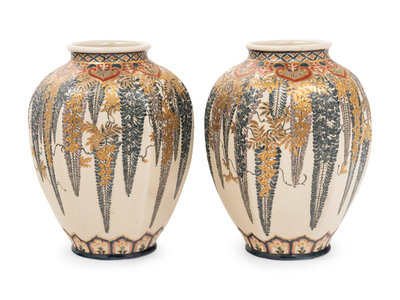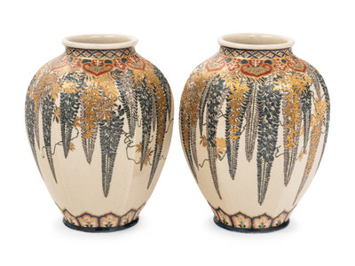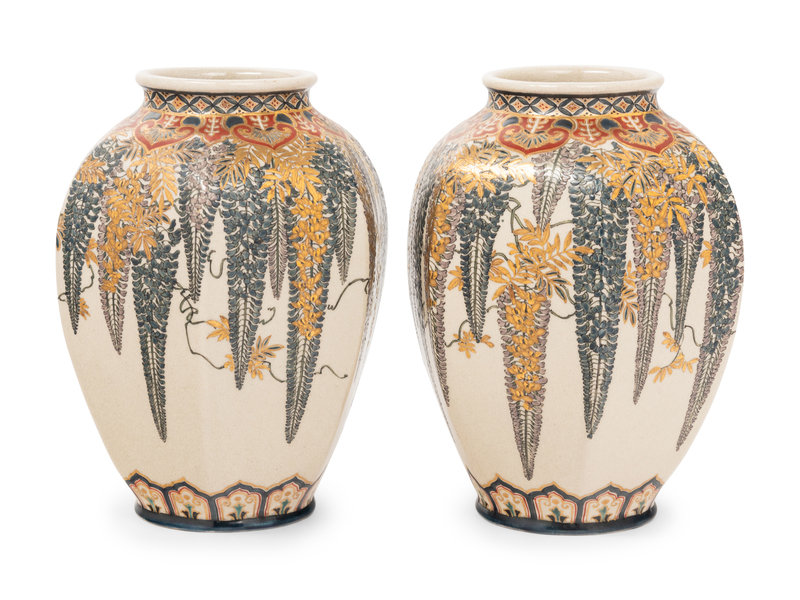 of baluster form, painted in gold and polychrome with wisteria vines.