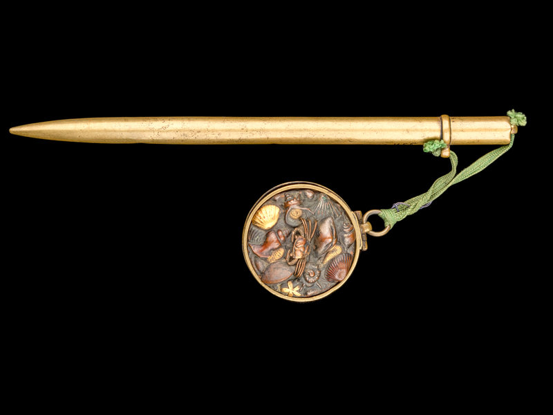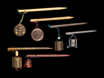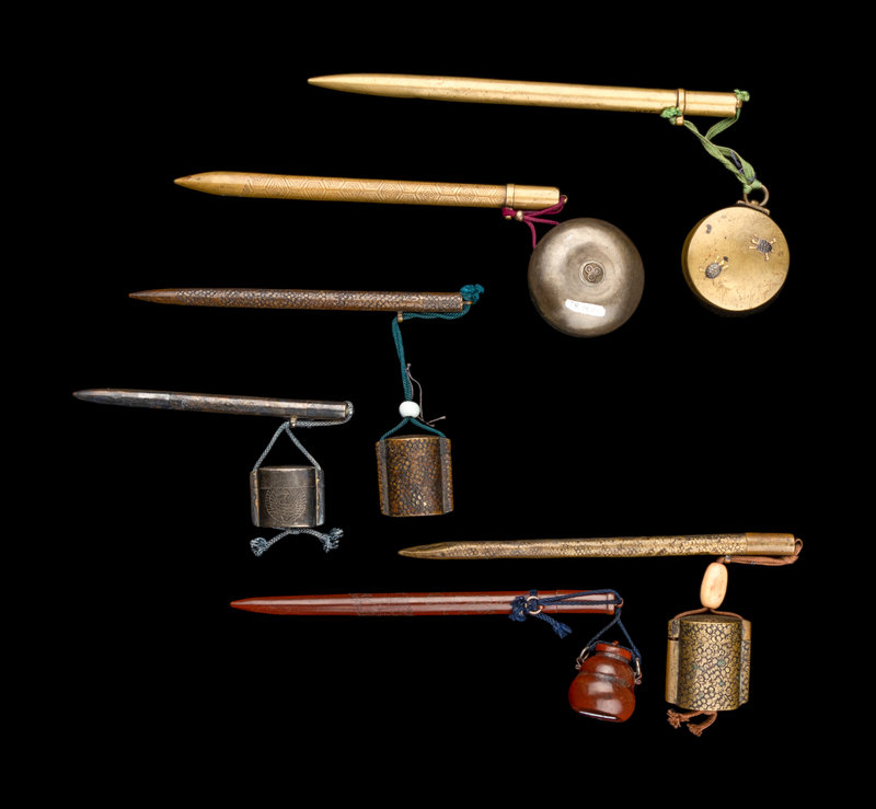 the first a brass example, together with a circular ink reservoir decorated with mix-metal shell-form inlays; the second another brass example chiseled with diaper cells, together with a bronze circular ink reservoir inset with an iron top decorated with a rat; the third also a brass example together with an inro-form ink reservoir; the fourth and the fifth two bronze examples, one with an inro-form ink reservoir, the other a jar shaped; the sixth a silver example with an inro-style ink reservoir.