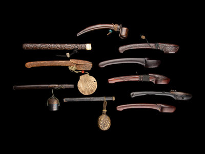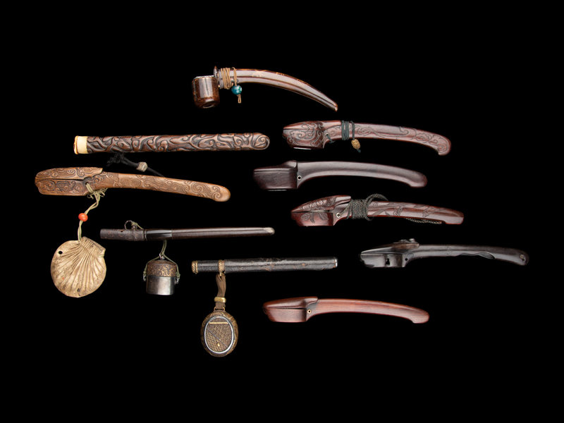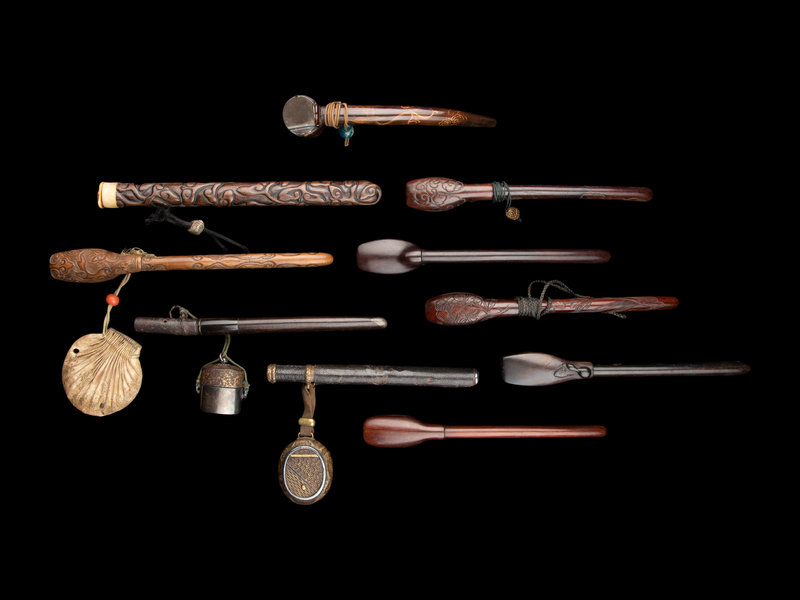 comprising an ebony example, a leather mounted wood example together with a mixed-metal ink reservoir; one metal mounted example together with a gilt inlaid metal inro-style ink reservoir; three carved wood examples; and three examples with plain sides.