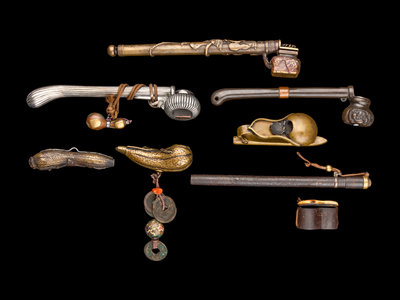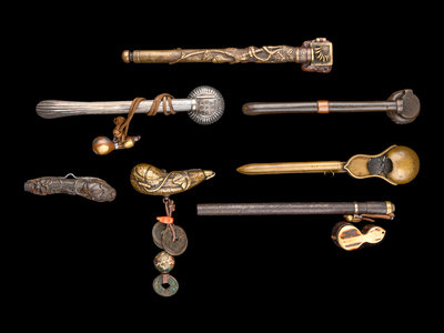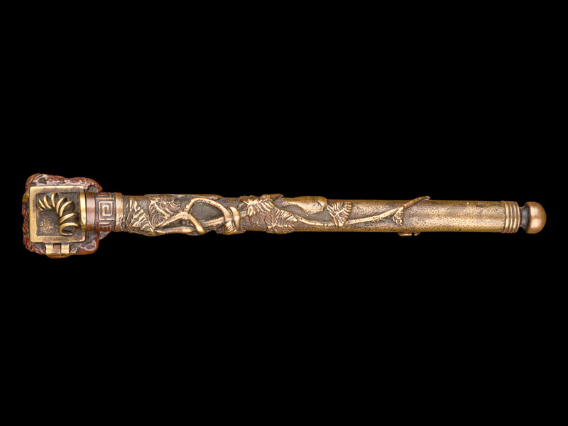 the first a bronze example decorated with gourd vines; the second a silver example together with a mixed-metal gourd shaped ink reservoir; the third a silver inlaid bronze example with gourd design; the fourth and the fifth bronze gourd-form examples; the sixth a gilt bronze example with a gourd-form ink reservoir; the seventh an incised bronze example, together with a gilt bronze gourd-form ink reservoir.