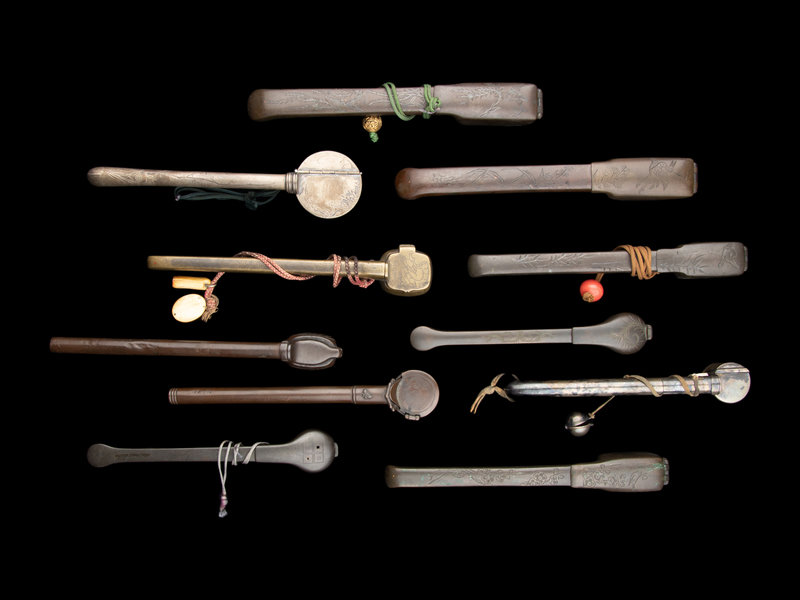 11 Japanese Incised Metal Portable Writing Sets, Yatate