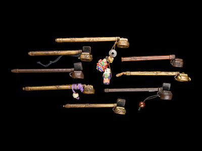 comprising five brass examples and three bronze examples, each with an ink reservoir in the form of a seal.