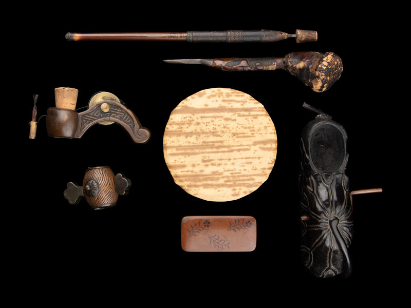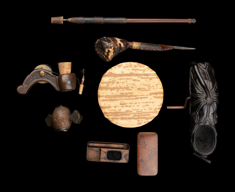 comprising a copper writing box, two sumitsubo, one barrel-form inkwell, one circular baren, and two scorpers.