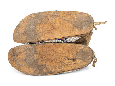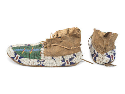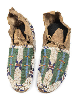 sinew-sewn and beaded with colors of translucent green, light blue, dark blue, greasy yellow, white, and rose