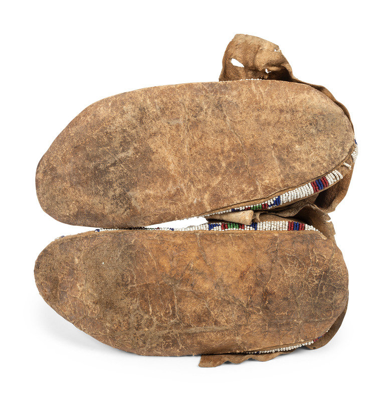a sinew-sewn pair, beaded on soft, smoke-tanned hide