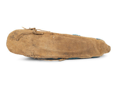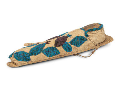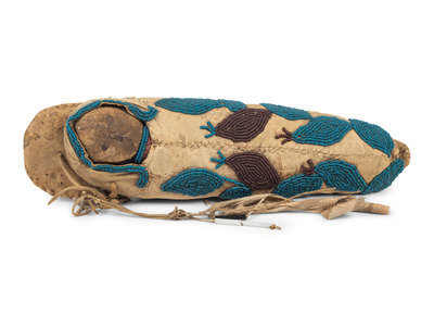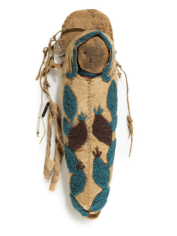 thread-sewn on soft hide housing a doll with hide head and cloth body; beaded abstract floral design in colors of pony trader blue and translucent plum